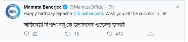 বিপাশার জন্মদিনের শুভেচ্ছা জানিয়ে এদিন মুখ্যমন্ত্রী মমতা বন্দ্যোপাধ্যায় ট্যুইট করে লেখেন, ‘Happy birthday Bipasha