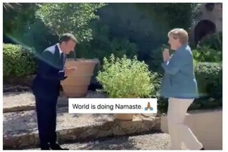 সম্প্রতি সোশ্যাল মিডিয়ায় একটি ভিডিও ভাইরাল হয়েছে। সেখানে দেখা যাচ্ছে, ফ্রান্সের প্রেসিডেন্ট ইমানুয়েল ম্যাকরন জার্মনির চান্সেলর অ্যাঞ্জেলা মার্কেলকে দু'হাত জোড় করে প্রণাম জানাচ্ছেন। এই ভিডিও দেখার পরেই মানুষ শেয়ার করতে শুরু করেছেন। তারা বলছেন ভারতের 'নমস্তে' রাজ করছে গোটা বিশ্বে।