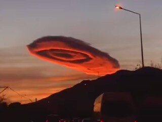 এক খণ্ড মেঘটিকে দেখতে অবিকল ভিনগ্রহীদের মহাকাশযান বা ইউএফও-এর মতো। লেন্টিক্যুলার মেঘের খণ্ড যখন ভেসে যাচ্ছিল, মনে হচ্ছিল যেন ইউএফও এগিয়ে যাচ্ছে। সূর্যোদয়ের সময় উজ্জ্বল কমলা রঙের ছোঁয়ায় এই মেঘ আরও অপরূপ হয়ে উঠেছে। সামাজিক মাধ্যমে নেটিজেনরা মুগ্ধ ইউএফও রূপী এই মেঘ দেখে।