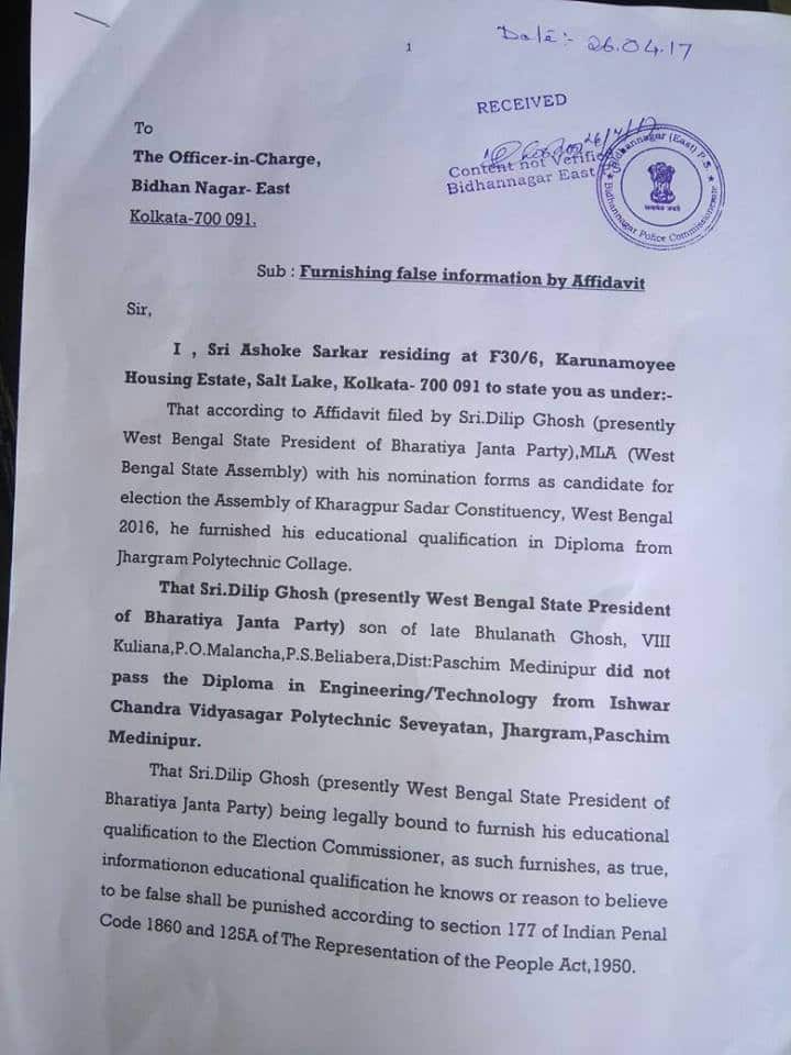 অশোক সরকার বিধাননগর থানায় অভিযোগ জানিয়েছেন যে দিলীপ ঘোষ ঝাড়গ্রাম পলিটেকনিক কলেজ থেকে ডিপ্লোমা পাশ করেননি ৷ এই তথ্যটি সম্পূর্ণ ভুল ৷