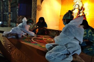 প্রতিবার সিমলা বিবেকানন্দ স্পোর্টিং ক্লাবের ভোগ রান্না করেন লতিকা মন্ডল। এবার পিপিই তিনি নিজে সারাক্ষণ পরে না থাকলেও, পাশের মেয়েরা অবশ্য পড়ে আছে পিপিই। লতিকা দেবী জানাচ্ছেন, এমনিতেই ঠাকুরের ভোগ রান্নার সময় কথা বলা হয় না। সবটাই ইশারায় করা হয়। এবার আর তার ওপর মাস্ক, স্কারফ সব ব্যবহার করতে হচ্ছে। ইশারায় বোঝাতে অসুবিধা হচ্ছে কিন্তু কিছু করার নেই আমাদের। লতিকা দেবীকে সাহায্য করছেন মন্দিরা ঘোষ ও মৌপিয়া মন্ডল। দু'জনেই জানাচ্ছেন, বাড়ির পুজো ও পাড়ার পুজো দুটোতেই আমরা কাজ করেছি। তবে এই অভিজ্ঞতা আমাদের হয়নি। আসলে এখন শুনছি বাতাসেও এই রোগের জীবাণু ভেসে বেড়ায়। তাই পিপিই পড়েই এই কাজ করছি। আশা করি আমরাও আক্রান্ত হব না। আমাদের দ্বারাও কেউ আক্রান্ত হবে না। পিপিই পড়ে দেওয়া হয়েছে আলপনা। এমনকি পুরোহিত মশাইয়ের জন্যেও আয়োজন ছিল পিপিই পোশাকের। তবে তিনি আর ওটা পরতে রাজি হননি৷ পিপিই'র পাশাপাশি ছিল অবশ্য স্যানিটাইজার। সেটা দিয়ে হাতশুদ্ধি অবশ্য সকলকেই করতে হয়েছে৷