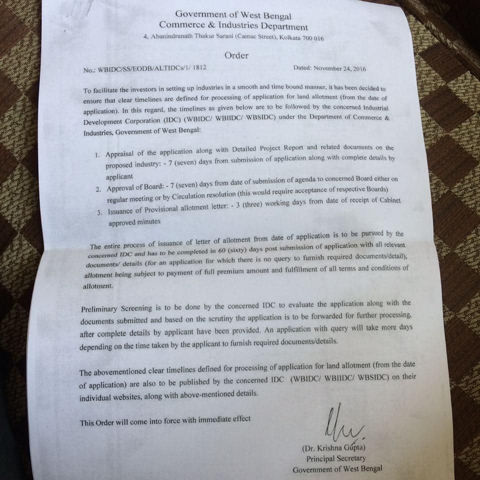 রাজ্য শিল্প দফতরের তরফ থেকে নির্দেশিকা দিয়ে জানানো হয়, রাজ্যে শিল্পায়নে গতি আনতেই এই সিদ্ধান্ত নেওয়া হয়েছে রাজ্য সরকারের পক্ষ থেকে ৷ নির্দেশিকা অনুযায়ী, নির্দিষ্ট শিল্প সম্পর্কে যাবতীয় তথ্য দিয়ে রাজ্য শিল্প দফতরে উপযুক্ত দরখাস্ত জমা দিতে হবে৷