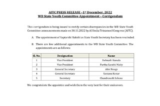 এদিন সকালে একটি বিবৃতি জারি করে তৃণমূলের তরফে পুনরায় জানানো হয়, যুব সম্পাদকের তালিকা থেকে সপ্তর্ষি বক্সির নাম বাদ পড়ছে। সেই সঙ্গে কমিটিতে নিয়ে আসা হচ্ছে আরও ৫ জনকে। গত বুধবার যুব সংগঠনের কমিটির যে তালিকা প্রকাশ করা হয়েছিল, তাতে কমিটির সদস্য সংখ্যা ছিল ৪৮। এদিন, সপ্তর্ষির নাম বাদ পড়ায় এবং আর ৫ নতুন মুখ কমিটিতে আসায় সেই সংখ্যা বেড়ে হল ৫২।