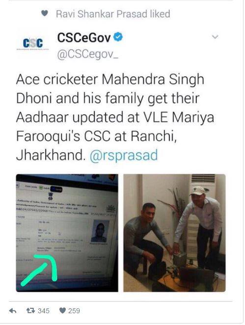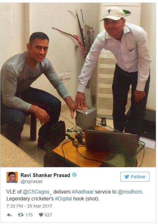 সম্প্রতি ধোনি তৈরি করিয়েছেন নিজের আধার কার্ড ৷ আর সেই ছবিই ট্যুইটারে পোস্ট করলেন কেন্দ্রীয় তথ্য প্রযুক্তি মন্ত্রী রবিশংকর প্রসাদ ৷ ধোনির আধার কার্ডের ছবি, ব্যক্তিগত তথ্য ট্যুইটারে শেয়ার করে রবিশংকর প্রসাদ লিখলেন, ‘ধোনির মতো বড়মাপের মানুষ আধার করালেন ৷ একেই বলে ডিজিটাল ইন্ডিয়ার শুভ শুরুওয়াত !’