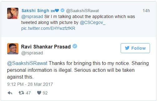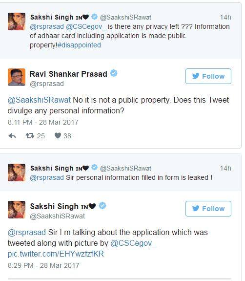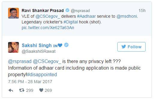 রবিশংকর প্রসাদকে রীতিমতো কটাক্ষ করে ধোনি পত্নী সাক্ষী ট্যুইট করলেন, ‘কোনও কিছুই কি আর ব্যক্তিগত নেই !’ রবিশংকর অবশ্য পুরো ব্যাপারটি ট্যুইট করে বোঝাতে চয়েছেন সাক্ষীকে ৷ পরে অবশ্য ধোনির আধার কার্ডের ফর্মের ছবি ফাঁস হওয়ায় ক্ষমা চেয়ে, তদন্তের ভারও নিয়েছেন তিনি ৷