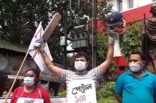 হাতে ক্রিকেট ব্যাট। সঙ্গে হেলমেট! সেঞ্চুরির পরে দু'হাত তুলে উচ্ছ্বাস। এক হাতে ব্যাট, অন্য হাতে হেলমেট! পেট্রোল সেঞ্চুরি পার করার বিরুদ্ধে অভিনব প্রতিবাদে সামিল হন মানুষ! শিলিগুড়ির গান্ধি মূর্তির পাদদেশে এমনই অভিনব প্রতিবাদে সামিল হয় দার্জিলিং জেলা ডিওয়াইএফআই। সঙ্গে ভ্যাকসিন কাণ্ডেরও প্রতিবাদ করা হয় সংগঠনের পক্ষ থেকে।