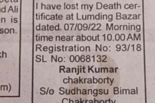 এক সংবাদপত্রের বিজ্ঞাপনের একটি ছবি ভাইরাল সোশ্যাল মিডিয়ায়। যেখানে সেই ব্যক্তি দাবি করেছে, তিনি তাঁর মৃত্যুর শংসাপত্র হারিয়ে ফেলেছেন। ব্যক্তির নাম রঞ্জিত কুমার চক্রবর্তী। সংবাদপত্রের 'মিসিং কলাম'-এ এই বিজ্ঞাপনটি দিয়েছেন। ব্যক্তির দাবি অনুযায়ী, তিনি গত ৭ সেপ্টেম্বর তাঁর মৃত্যুর শংসাপত্রটি হারিয়ে ফেলেছেন। এমনকি হারানো শংসাপত্রের ক্রমিক নম্বরও দিয়েছেন রঞ্জিত। জানিয়েছেন, অসমের লামডিং বাজারে হারিয়ে ফেলেছেন তিনি।