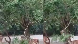 সংক্ষিপ্ত এই চমৎকার ভিডিওটিতে আমরা দেখতে পাচ্ছি দুটি হরিণ একটি গাছের নিচে দাঁড়িয়ে পাতা খাওয়ার চেষ্টা করছে । ডাল বেশি উঁচু হওয়ায় তারা খেতে পারছে না। ঠিক সেই মুহুর্তে, একটি বাঁদর এসে উপস্থিত হয় এবং শাখাটি নিচু করে, হরিণদের খাওয়ার সুবিধা করে দেয়।বানরটির উদারতা দেখে নেটিজেনরা অবাক হয়ে গেছেন। কীভাবে সে তার হরিণ বন্ধুদের পাতা খেতে সাহায্য করার জন্য গাছের ডালের উপরে এবং নীচের দিকে চলাফেরা করছে তা সত্যি দেখার মতো।ভিডিওটি এখানে দেখুন ।