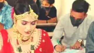 পরীক্ষার হলে বিয়ের সাজে বসে রয়েছে কনে। এমন ছবি দেখে অনেকেই নিজের চোখ দুটিতে বিশ্বাস রাখতে পারবেন না। রাজকোটের শান্তি নিকেতন কলেজের অনেকেও এমন ছবি দেখে অবাক হয়ে যান। তবে শিবাঙ্গী বাগথারিয়ার দাবি, জীবনে সব কিছু অপেক্ষা করতে পারে। এমনকী বিয়েও। তবে পরীক্ষা তো আর অপেক্ষা করে থাকবে না। তাই তিনি বিয়ের থেকেও বেশি গুরুত্বপূর্ণ বিষয় হিসেবে বিবেচনা করলেন পরীক্ষাকে। আর কনের এমন ইচ্ছেয় সায় দিল তাঁর বর। ফলে ব্যাপারটা সহজেই হয়ে গেল।