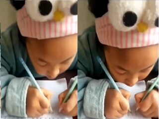 যেখানে শিশুদের পড়তে বসানো মুশকিল হয়ে পড়ে, সেখানে লেখার খাতায় ২ হাত দিয়েই কলম চালাচ্ছে মেয়েটি। খাতার একের পর এক পাতা ভরাচ্ছে ২ হাত দিয়ে। দেখে মনে হচ্ছে ২ হাত দিয়ে লিখতে সামান্য কষ্ট হচ্ছে না তার। শিশুর এই আজব কেরামতি দেখে আশ্চর্য হয়েছেন অনেকেই।