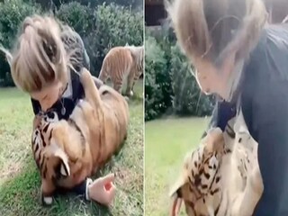 ভিডিওতে দেখা গিয়েছে, এক সঙ্গে ৩-৪টে বাঘের সঙ্গে খেলা করছে এক মহিলা। আরও আশ্চর্যের এক ব্যপার হল, তারই মধ্যে একটি বাঘকে একেবারে জড়িয়ে ধরে আদর করছে মহিলাটি। শুধুতাই নয়, বাঘের ঠোঁটে চুমুও দিচ্ছে সে। মহিলাটি বাঘটিকে ছাড়তে গেলেও কিছুতেই তাকে ছাড়তে চাইছে না বাঘ।বাঘের আদরের ঠেলায় রীতিমত কাহিল হয়ে পড়ে সেই মহিলা।