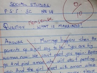 উত্তরপত্রের একটি ছবি ট্যুইটারে ভাইরাল হয়ে গেছে। @srpdaa নামে এক ট্যুইটার ব্যবহারকারীর পোস্ট করা ছবিতে উত্তরপত্রের ছবি দেখা যাচ্ছে। যেখানে বিবাহের বর্ণনায় ছাত্রটি লিখেছে, “বিয়ে হল, যখন কোনও মেয়ের বাবা-মা তাকে বলে, 'তুমি এখন বড় হয়েছ… আমরা তোমাকে আর খাওয়াতে পারব না। এবার ভালয় ভালয় একজন লোককে খুঁজে বের করো যে তোমাকে খাওয়াবে..."! এখানে কিন্তু শেষ নয়, বরং বলা ভাল বিয়ে নিয়ে নিজস্ব ব্যাখ্যার এই শুরু। ফলে ছাত্রটি আরও লিখেছে, “এবং তার পর মেয়েটি এমন একজন ব্যক্তির সঙ্গে দেখা করে যাকে তার বাবা-মাও বিয়ে করার জন্য ব্যতিব্যস্ত করে তুলেছে। দুজনেই তখন নিজেদের এক পরীক্ষার মধ্যে ফেলে। শুরু করে একসঙ্গে বসবাস করা। আর সন্তানধারণের জন্য আজেবাজে কাজ করা শুরু করে।"