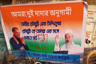 প্রদেশ কংগ্রেস সভাপতি অধীর চৌধুরীর সঙ্গে তৃণমূল কংগ্রেস বিধায়ক সিদ্দিকুল্লা চৌধুরীর পোস্টার কি তবে রাজ্য রাজনীতিতে নতুন সমীকরণের ইঙ্গিত দিচ্ছে! সেই জল্পনাই এখন ঘোরাফেরা করছে পূর্ব বর্ধমান জেলার রাজনৈতিক মহলে। মঙ্গলকোটের কিষাণ মান্ডির পাশে এই ব্যানার দেখা গিয়েছে। তাতে প্রদেশ কংগ্রেস সভাপতি অধীর চৌধুরীর সঙ্গে স্থানীয় বিধায়ক সিদ্দিকুল্লা চৌধুরীর ছবি দিয়ে তাদের একসঙ্গে কাজ করার আহ্বান জানানো হয়েছে। স্থানীয় কংগ্রেস নেতৃত্বের পক্ষ থেকে এই ব্যানার দেওয়া হয়েছে বলে দাবি করা হয়েছে। সেই ব্যানারকে ঘিরে এখন রাজনৈতিক মহলে জল্পনা তুঙ্গে।