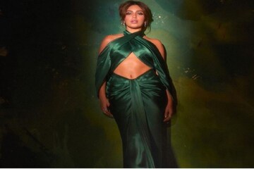 খোলা পিঠ, সবুজ সাটিনের লং-কাউআউট গাউনে মোহময়ী ভূমি