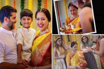 হলুদ, লাল চওড়া পাড়ের কাঞ্জিভরম, হীরের গয়নায় আগাগোড়া ট্র্যাডিশনাল লুক-এ সমীরা। অক্ষয় আর হংস দু'জনেই ফ্রেমবন্দি সাদা কুর্তা পায়জামাতে। Photo Source: Sameera Reddy/ Instagram