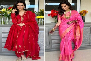 শাশুড়ির দেওয়া শাড়িতে সেজেছেন করিশ্মা।