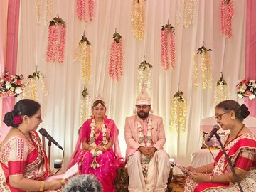 মহিলা পুরোহিতদের তত্ত্বাবধানে বৈদিক মতে বিয়ে সারলেন সন্দীপ্তা-সৌম্য। তাঁদের বিশেষ মুহূর্তের সাক্ষী রইলের কাছের মানুষরা।