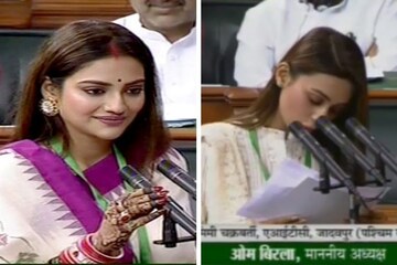 হাতে মেহেন্দি, সিঁথিতে সিঁদুর... নববধূর বেশে সংসদে বাংলায় শপথ নিলেন নুসরত