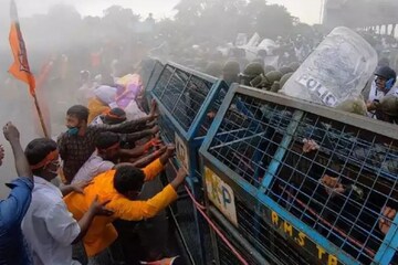 ব্যারিকেড ভাঙতে না পেরে টপকানোর চেষ্টা করছে বিজেপি কর্মী সমর্থকেরা। ছোড়া হচ্ছে পাথর। বাঁশের ব্যারিকেড ভেঙে উপড়ে তাই ছোড়া হচ্ছে পুলিশকে লক্ষ্য করে। ভাঙা হয়েছে পুলিশের কিয়োস্ক। ফাটানো হচ্ছে টিয়ার গ্যাসের সেল।
