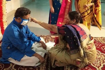 তারপর একেবারে পোশাক চেঞ্জ ৷ নীল পঞ্জাবি থেকে একেবারে সাদা ধবধবে ধুতি-পঞ্জাবি৷ মুখে অবশ্যই মাস্ক রয়েছে ৷