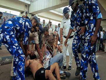 বিকাশ ভবনের সামনে ধুন্ধুমার পরিস্থিতি যে আন্দোলনকারীরা 'অর্ধনগ্ন' প্রতিবাদ শুরু করছিলেন তাঁদের একে একে আটক করা হয়েছে। চাকরিহারাদের সঙ্গে পুলিশের কার্যত ধস্তাধস্তি চলে এই ধরপাকড়ের সময়।