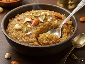এবার এতে কিসমিস এবং অন্য ড্রাই ফ্রুটস, সঙ্গে এক চিমটি লবণ দিতে হবে। মিষ্টি পদে লবণ দেওয়া নিয়ে অনেকের খুঁতখুঁতুনি থাকে, চাইলে লবণ নাও দেওয়া যায়, তবে দিলে হালুয়ার স্বাদ বাড়বে বই কমবে না। দিতেও হবে ওই এক চিমটিই, তার চেয়ে বেশি কোনও ভাবেই নয়।যতক্ষণ পর্যন্ত না সুজির রঙ সোনালি-বাদামি হয়ে আসে, ততক্ষণ পর্যন্ত রান্না করতে হবে। ক্রমাগত নাড়তে হবে যাতে হালুয়া পাত্রে লেগে না যায়। ঘি ছাড়তে শুরু করলেই বুঝতে হবে হালুয়া তৈরি হয়ে গিয়েছে। আর কী! এবার একটা পাত্রে তুলে আরেকটু শুকনো ফল দিয়ে সাজিয়ে পরিবেশন করলেই হল! (Representative Image)