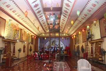 টুকরো আয়না দেওয়া কাপড়, মটকা, রাজস্থানী পুতুল৷ এসব দিয়েই তৈরি হচ্ছে প্যান্ডেল৷ এবার মহিলারা রয়েছে মন্ডপ সজ্জার দায়িত্বে৷ মন্ডপের সামনে থাকবে রঙ্গোলিও৷