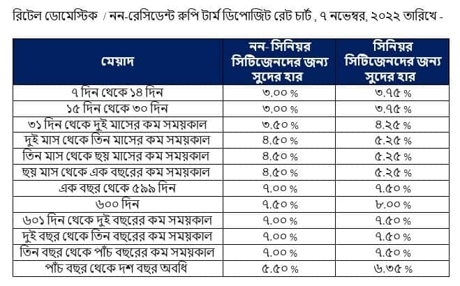 রিটেল ডোমেস্টিক / নন-রেসিডেন্ট রুপি টার্ম ডিপোজিট রেট চার্ট , ৭ নভেম্বর, ২০২২ তারিখে -