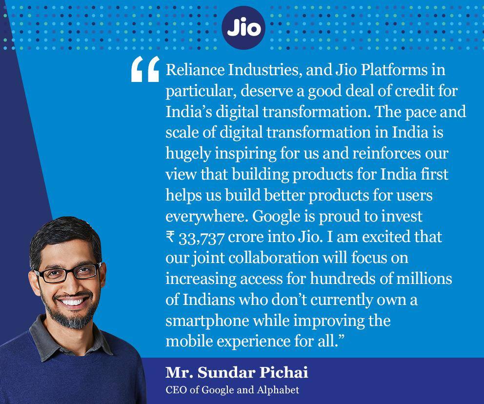 Everyone should have access to the internet. Proud to partner with @reliancejio to increase access for the hundreds of millions in India who don’t own a smartphone with our 1st investment of $4.5B from the #GoogleForIndia Digitization Fund.https://t.co/1fP8iBZQfm