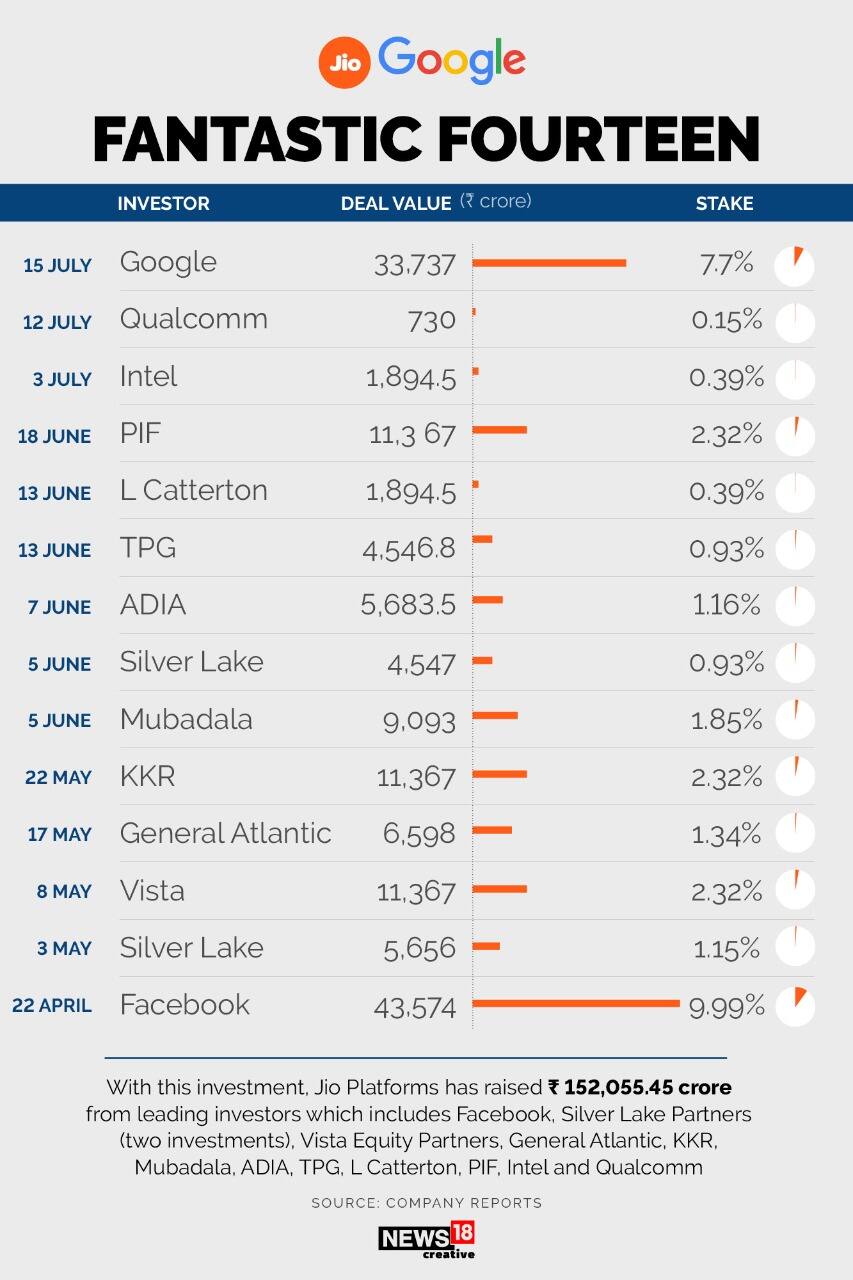 সংস্থার চেয়ারম্যান মুকেশ আম্বানি এদিন জানিয়েছেন, গুগলকে অভ্যর্থনা জানাতে পেরে তিনি খুব খুশি। জিও-তে সাম্প্রতিক সময়ে যে বিশ্বখ্যাত সংস্থাগুলি বিনিয়োগ করেছে, তার মধ্যে রয়েছে ফেসবুক (৪৩,৫৭৩.৬২ কোটি টাকা), সিলভার লেক পার্টনার্স (৫৬৫৫.৭৫ কোটি টাকা), ভিস্তা ইক্যুইটি পার্টনার্স (১১,৩৬৭ কোটি টাকা), জেনারেল অ্যাটলান্টিক (৬৫৯৮.৩৮ কোটি টাকা), কেকেআর (১১,৩৬৭ কোটি টাকা), মুবাডালা (৯০৯৩ কোটি টাকা), সিলভার লেক (৪,৫৪৭ কোটি টাকা)-র, আবু ধাবি ইনভেস্টমেন্ট অথরিটি বা ADIA-এর (৫৬৮৩.৫০ কোটি টাকা), টিপিজি ক্যাপিটাল (৪৫৪৬.৮০ কোটি টাকা), এল ক্যাটারটন (১৮৯৪.৫০ কোটি টাকা) , পিআইএফ (১১,৩৬৭ কোটি টাকা), ইন্টেল (১,৮৯৪.৫০ কোটি টাকা), কোয়ালকম ৭৩০ কোটি টাকা ৷ এবার গুগলের হাত ধরে ১৪তম বিদেশি বিনিয়োগ এল জিও প্ল্যাটফর্মে ৷ করোনার জেরে লকডাউন ৷ আর তার জন্য অধিকাংশ সংস্থার ব্যবসা যখন প্রবল ক্ষতির সম্মুখীন ৷ তখন একের পর এক চমক দেখাচ্ছে জিও ৷ ফেসবুক থেকে গুগল- বিশ্বের তাবড় তাবড় সংস্থারাই জিও-তে লগ্নি করার বিষয়ে আগ্রহ প্রকাশ করেছে ৷