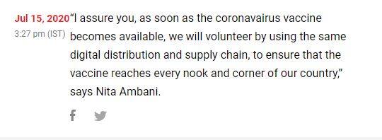 তিনি এদিন করোনা ভাইরাসের ভ্যাকসিন নিয়েও মন্তব্য করেন। তিনি বলেন, ‘দেশে করোনা ভাইরাস ভ্যাকসিন আবিষ্কৃত হলে সংস্থার নিজস্ব ডিজিট্যাল চেইন ব্যবহার করে আমরা নিশ্চিত করব যাতে দেশের প্রতিটি অংশে এই ভ্যাকসিন পৌঁছে যায়।’