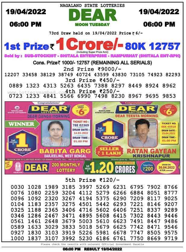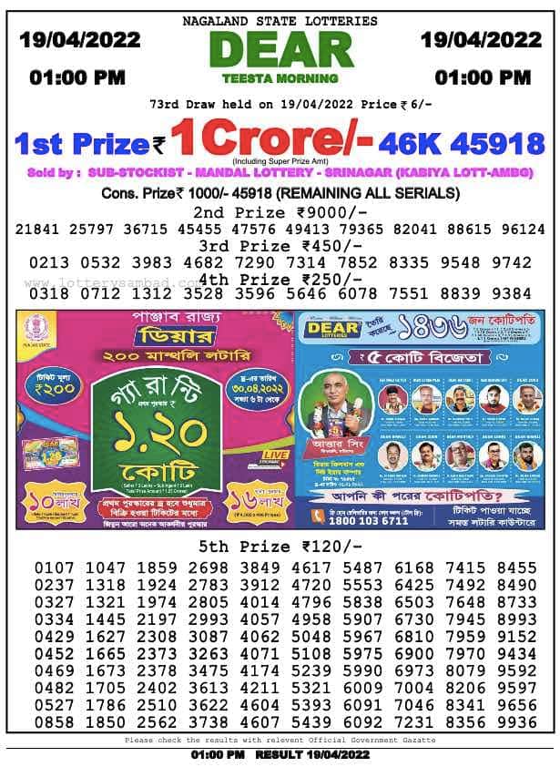 Nagaland State Lottery Sambad Results for April 19, 2022: নাগাল্যান্ড লটারির এক একটি টিকিটের মূল্য মাত্র ৬ টাকা। এক একটি টিকিটের মূল্য মাত্র ৬ টাকা হলে নাগাল্যান্ড লটারির পুরস্কার মূল্য ১ কোটি টাকা ।