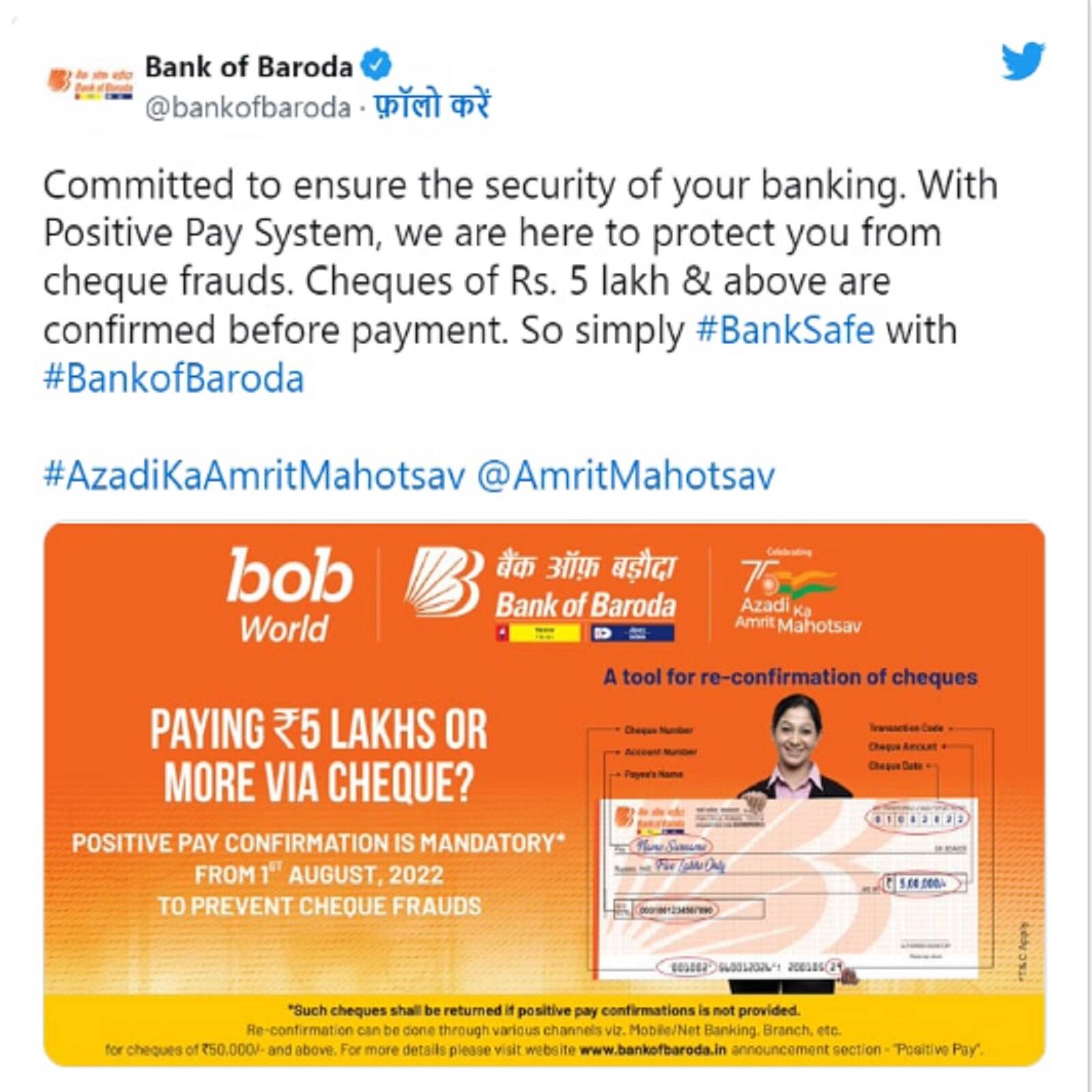 Bank of Baroda একটি ট্যুইটের মাধ্যমে জানিয়েছেন পয়লা অগাস্ট থেকে চেক পেমেন্টের নিয়ম বদলে গিয়েছে ৷ কেন্দ্রীয় ব্যাঙ্ক RBI এর গাইডলাইনস মেনে পাবলিক সেক্টর ব্যাঙ্ক ব্যাঙ্ক অফ বরোদা তাদের চেক পেমেন্টের নিয়মে বেশ কিছু পরিবর্তন করেছে ৷ ব্যাঙ্ক অফ বরোদা তাদের গ্রাহকদের জানিয়েছেন ১ অগাস্ট থেকে ৫ লক্ষ বা তার বেশি অ্যামাউন্টের চেক পেমেন্টের জন্য পজিটিভ পে সিস্টেম (Positive Pay System) বাধ্যতামূলক করে দেওয়া হয়েছে ৷ এছাড়া চেক পেমেন্ট করা যাবে না ৷