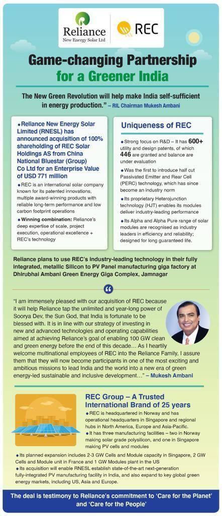 ক্ষমতা, নির্ভরযোগ্যতা এবং দীর্ঘমেয়াদ- এই সব কারণে REC-এর Alpha এবং Alpha Pure শ্রেণির সৌর মডিউল দারুণ স্বীকৃতি লাভ করেছে। তাই এই অধিগ্রহণের ফলে রিলায়েন্সের সুবিধা হবে। কারণ এই ধরনের শিল্পক্ষেত্রে সাধারণ ভাবে ব্যবহৃত অন্যান্য সমস্ত প্রযুক্তিকে ছাপিয়ে যেতে সক্ষম হবে ওই সংস্থা।