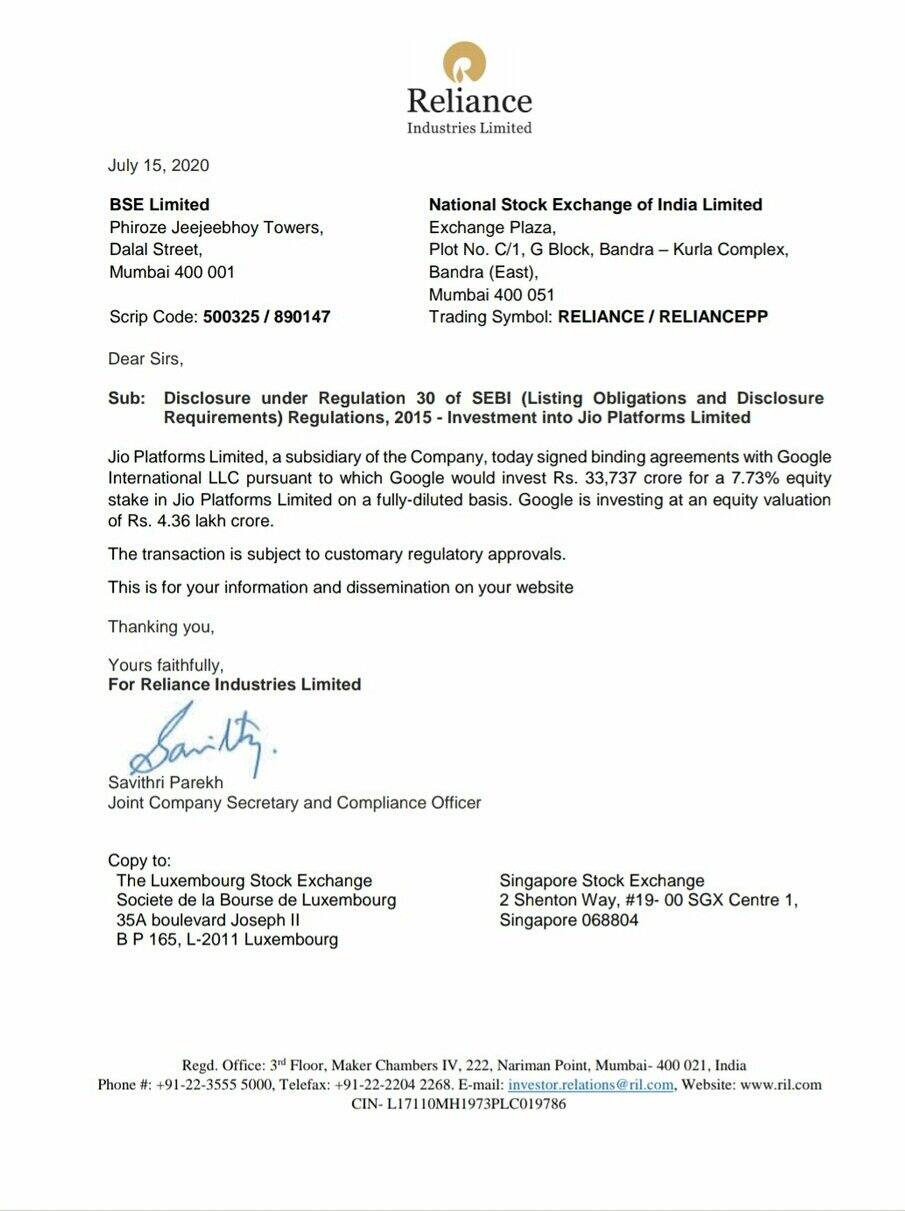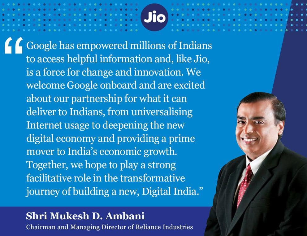 জিও-তে এবার বিনিয়োগ করতে চলেছে গুগলও ৷ জিও-র ৭.৭৩ শতাংশ শেয়ার কিনছে গুগল ৷ জিও প্ল্যাটফর্মে ৩৩,৭৩৭ কোটি টাকা বিনিয়োগ করছে গুগল ৷ ৪.৩৬ লক্ষ কোটি টাকা দরে জিও প্ল্যাটফর্মের ইক্যুয়িটি শেয়ার কিনছে গুগল ৷ এমনটা এদিন এজিএমে ঘোষণা করেন রিলায়েন্স ইন্ডাস্ট্রিজের চেয়ারম্যান মুকেশ আম্বানি ৷