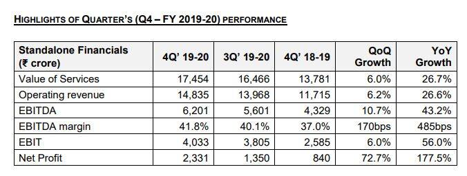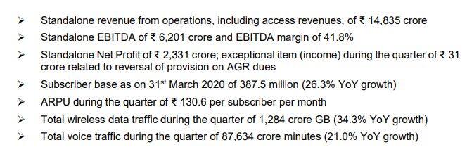 রিলায়েন্স জিও ইনফোকম লিমিটেডের গত অর্থবর্ষে সবমিলিয়ে বৃদ্ধির হার ১৭৭.৫ শতাংশ ৷ রাজস্ব বৃদ্ধি পেয়েছে ৬.২ শতাংশ ৷ সবমিলিয়ে টাকার অঙ্কে যা ১৪৮৩৫ কোটি টাকা ৷ ইন্টারনেট ডেটার ব্যবহারও বেড়েছে ৷ ডিসেম্বর ত্রৈমাসিকে (Q3) যা ছিল ইউজার প্রতি ১১.১ জিবি, সেটা শেষ ত্রৈমাসিকে (Q4) বেড়ে হয়েছে ১১.৩ জিবি ৷ সাবস্ক্রাইবার সংখ্যাও বেড়েছে অনেকাংশেই ৷ লকডাউনের মধ্যে ইন্টারনেট ব্যবহার বেড়েছে ৫০ শতাংশের বেশি ৷