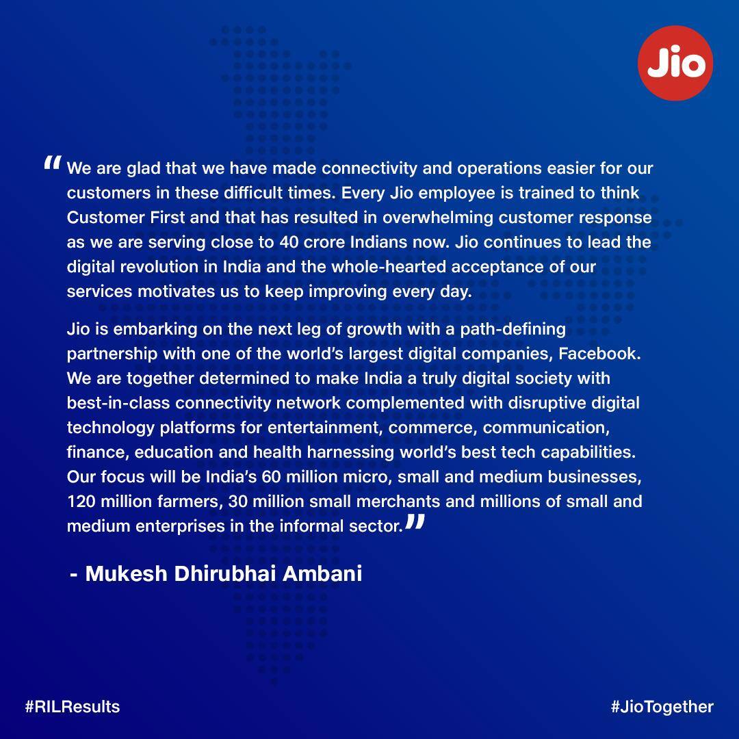 তবে লকডাউনের মধ্যেই ইতিহাসও গড়েছে রিলায়েন্স। রিলায়েন্স জিওর ৯.৯৯ শতাংশ শেয়ার নিয়েছে ফেসবুক। ৪৩ হাজার ৫৭৪ কোটি টাকা ঢালছে মার্ক জুকারবার্গের সংস্থা। দুনিয়ার সবচেয়ে বেশি ফেসবুক গ্রাহক ভারতে। দুনিয়ার অন্যতম বড় টেলিকম সংস্থা রিলায়েন্স জিও। এই দুই সংস্থা হাত মেলানোয় ডিজিটাল দুনিয়ায় আলোড়নের সম্ভাবনা দেখছেন বিশেষজ্ঞরা। বিশেষত খুচরো ব্যবসা, ও ডিজিটাল লেনদেনে আরও বড় চমকের অপেক্ষা।