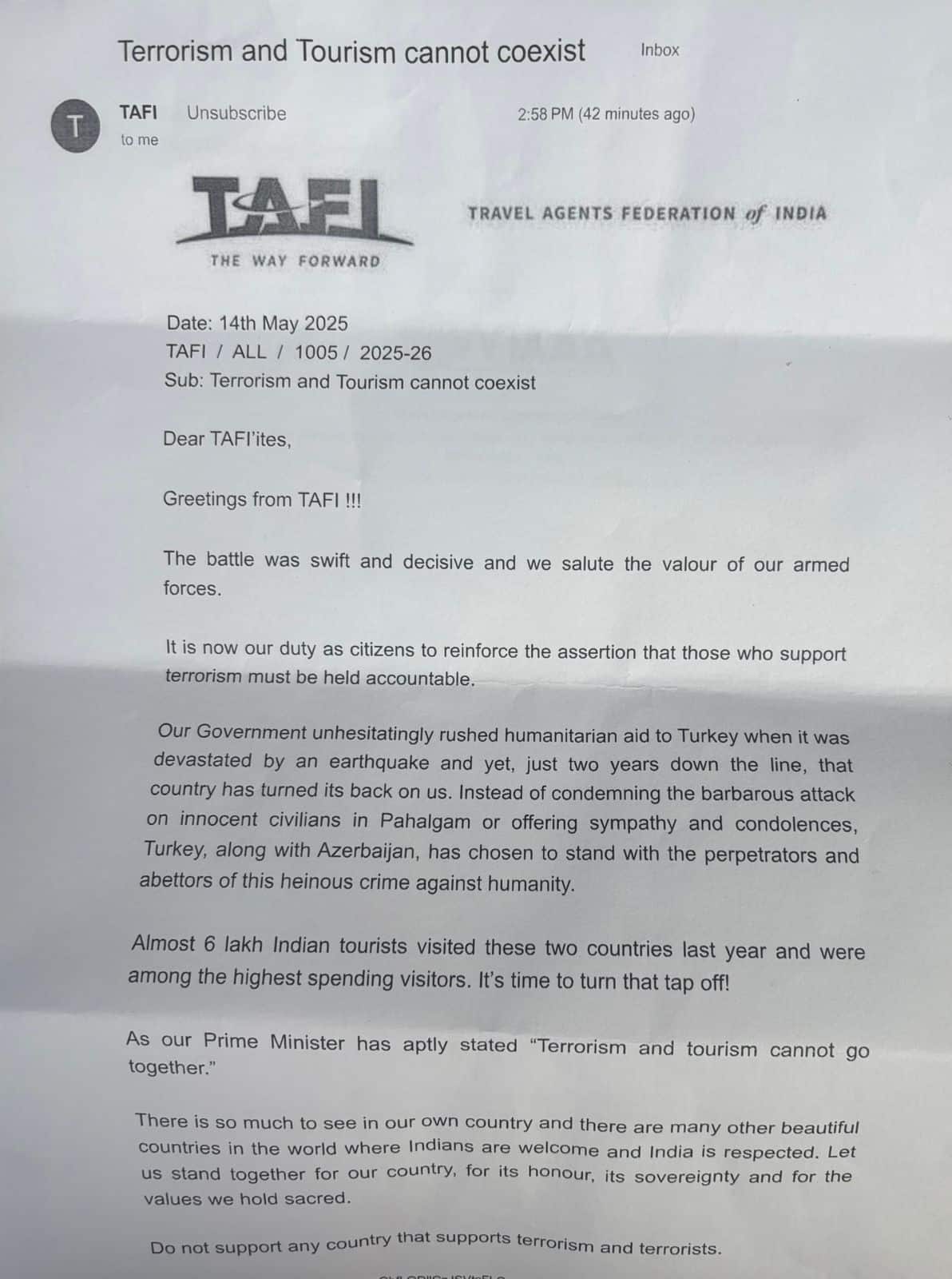 TAFI-র ন্যাশনাল কমিটির সদস্য অনিল পাঞ্জাবি জানিয়েছেন, ‘‘আমাদের পর্যটকরা পহেলগাঁও গিয়েছিলেন বিমানে, ফিরে এল কফিনে। যারা এই কাজ করেছিল, তাদের সাহায্য করেছিল তুরস্ক। যদিও ২০২৩ সালে ভূমিকম্পের সময়ে আমরা ওদের সমস্ত দিক থেকে সাহায্য করেছিলাম। ওই দেশের পর্যটন ব্যবসার উপর অর্থনীতি নির্ভর করে। এর পরেও ওরা যে কাজ করেছে, তা ক্ষমার অযোগ্য। বিশ্বে আরও ২০০ দেশ আছে। সেখানে যাতায়াত করুক মানুষ। তাই আমরা তুরস্কের সঙ্গে সমস্ত পর্যটন বাতিল করছি।’’