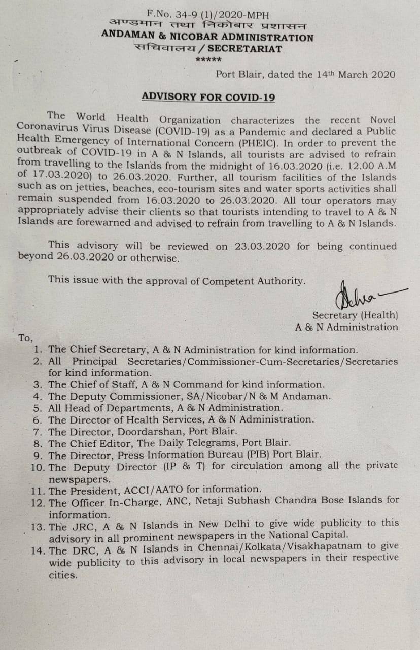 আন্দামান ও নিকোবর প্রশাসনের একটি নির্দেশিকায় এ দিন বলা হয়েছে যে, করোনা আতঙ্কের জেরে ১৬ মার্চ থেকে ২৬ মার্চ পর্যন্ত পর্যটন বন্ধ রাখার সিদ্ধান্ত নেওয়া হয়েছে।