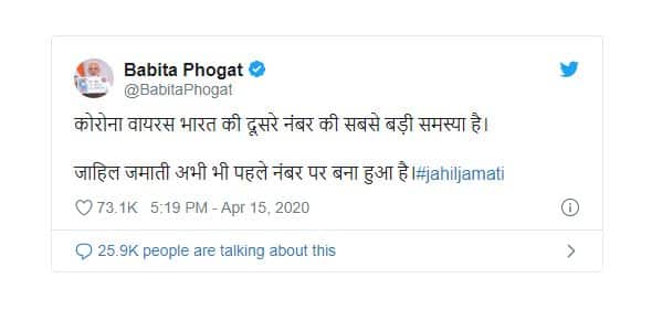 ববিতা ট্যুইটে এদিন লিখেছেন, ‘‘ করোনা ভাইরাস সমস্যা এখনও ভারতের দ্বিতীয় সমস্যা ৷ আসল সমস্যা এখনও ‘জাহিল জামাতি’-রাই ’’৷