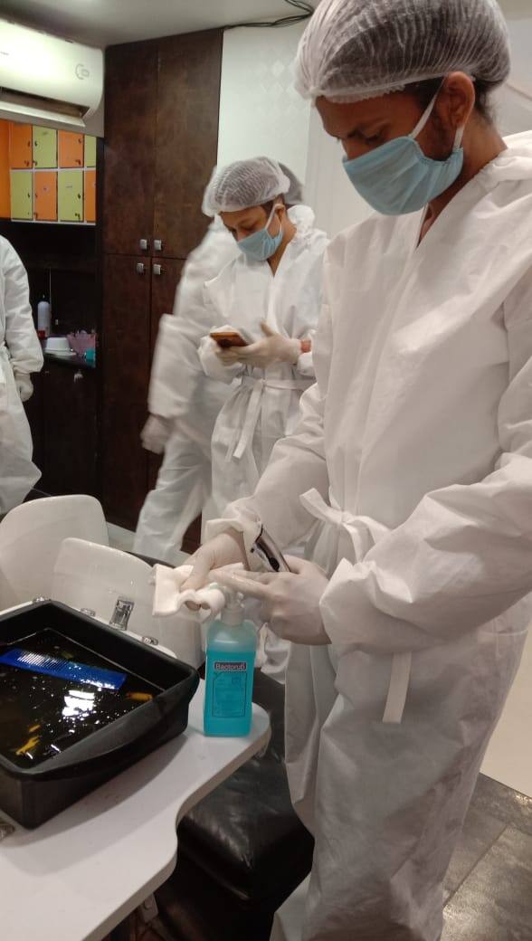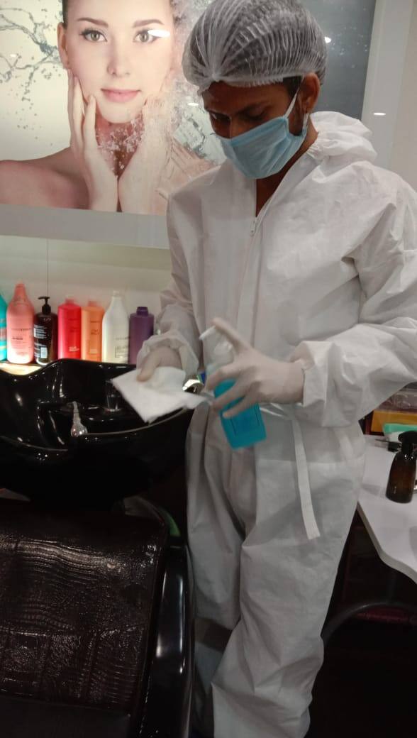 মাথার চুল থেকে পায়ের নখ পর্যন্ত ঢাকার ব্যবস্থা হয়েছে কর্মীদের। পিপিই ছাড়াও মুখে মাস্ক, হাতে গ্লাভস, ফেস গার্ড পরে কাজ করছেন সবাই। কোনও ব্যক্তি আসলে প্রথমেই তাঁর থার্মাল চেকিং করে শরীরের তাপমাত্রা দেখে নেওয়া হচ্ছে। হাত স্যানিটাইজার দিয়ে মুছে নিতে বলা হচ্ছে। মাস্ক পরে আসাটা বাধ্যতামূলক। একান্ত কোনও ব্যক্তি মাস্ক না পরে আসলে দোকান থেকেই তাকে মাস্ক দেওয়া হচ্ছে। চুল কাটার সময় মাস্ক পরে থাকাটা বাধ্যতামূলক। দাড়ি কাটার ক্ষেত্রে কাস্টমারের মাস্ক খুলে কাজ করছেন কর্মীরা। তবে সংশ্লিষ্ট ব্যক্তি থেকে আগে অনুমতি নেওয়া হচ্ছে তিনি মাস্ক খুলে দাড়ি কাটাতে চান কিনা। সম্মতি পেলে তবেই দাড়ি কাটা হচ্ছে।