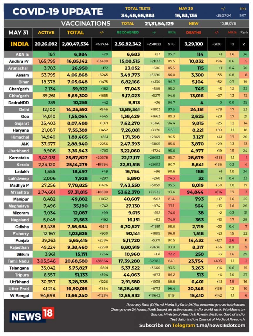 দেশের মধ্যে মহারাষ্ট্র, কেরল, দিল্লি এবং কর্ণাটকের দৈনিক সংক্রমণ সবথেকে বেশি। সরকারি হিসেবে মহারাষ্ট্রে মোট আক্রান্তের সংখ্যা দাঁড়িয়েছে ৫৭ লক্ষ ৩১ হাজার ৮১৫ আর মৃত্যু হয়েছে ৯৪,৮৪৪ জনের৷ গত ২৪ ঘণ্টায় মহারাষ্ট্রে নতুন করে করোনা আক্রান্ত হয়েছেন ১৮,৬০০ জন আর মৃত্যু হয়েছে ৮১৪ জনের। কেরলে আক্রান্ত ২৫ লক্ষ ৪৭ হাজার ৮২৭ জন। মৃত্যু হয়েছে ৮,৬৪১ জনের। গত ২৪ ঘণ্টায় আক্রান্ত হয়েছে ১৯,৮৯৪ জন। কর্ণাটকে আক্রান্তের সংখ্যা বেড়ে দাঁড়িয়েছে ২৫ লক্ষ ১৪ হাজার ২৭৯ জন আর মৃত্যু হয়েছে ২৮,৬৭৯ জনের। গত ২৪ ঘণ্টায় আক্রান্ত হয়েছে ২০,৩৭৮ জন। তামিলনাড়ুতে মোট আক্রান্তের সংখ্যা দাঁড়িয়েছে ২০ লক্ষ ৬৮ হাজার ৫৮০ জন আর মৃত্যু হয়েছে ২৩,৭৫৪ জনের।
