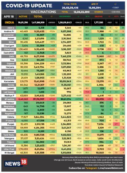 স্বাস্থ্য মন্ত্রক সূত্রে জানা গিয়েছে, দেশে এখন পর্যন্ত ১ কোটি ২৮ লাখ ৯ হাজার ৬৪৩ জন সুস্থ হয়েছে উঠেছে৷ বর্তমানে সক্রিয় করোনা আক্রন্তের সংখ্যা ১৮ লাখ ১ হাজার ৩১৬জন। গত ২৪ ঘণ্টায় ১ লক্ষ ৭৭ হাজার ১৫০জনের মৃত্যু হয়েছে৷