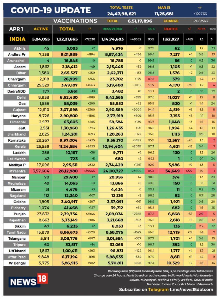 দেশের মধ্যে মহারাষ্ট্র, গুজরাত, পঞ্জাব এবং কর্ণাটকের দৈনিক সংক্রমণ সবথেকে বেশি। সরকারি হিসেবে মহারাষ্ট্রে মোট আক্রান্তের সংখ্যা দাঁড়িয়েছে ২৮ লক্ষ ১২ হাজার ৯৮০ আর মৃত্যু হয়েছে ৫৪,৬৪৯ জনের৷ গত ২৪ ঘণ্টায় মহারাষ্ট্রে নতুন করে করোনা আক্রান্ত হয়েছেন ৩৯,৫৪৪ জন আর মৃত্যু হয়েছে ২২৭ জনের। মহারাষ্ট্র জুড়ে ইতিমধ্যেই চালু হয়েছে রাত্রিকালীন কার্ফু। কেরলে আক্রান্ত ১১ লক্ষ ২৪ হাজার ৫৮৪ জন। মৃত্যু হয়েছে ৪,৬২১। গত ২৪ ঘণ্টায় আক্রান্ত হয়েছে ২,৬৫৩ জন। কর্ণাটকে আক্রান্তের সংখ্যা বেড়ে দাঁড়িয়েছে ৯ লক্ষ ৯৭ হাজার ৪ আর মৃত্যু হয়েছে ১২,৫৬৭ জনের। অন্ধ্রপ্রদেশে আক্রান্ত ৯ লক্ষ ১ হাজার ৯৮৯ জন। মৃত্যু হয়েছে ৭,২১৭ জনের।