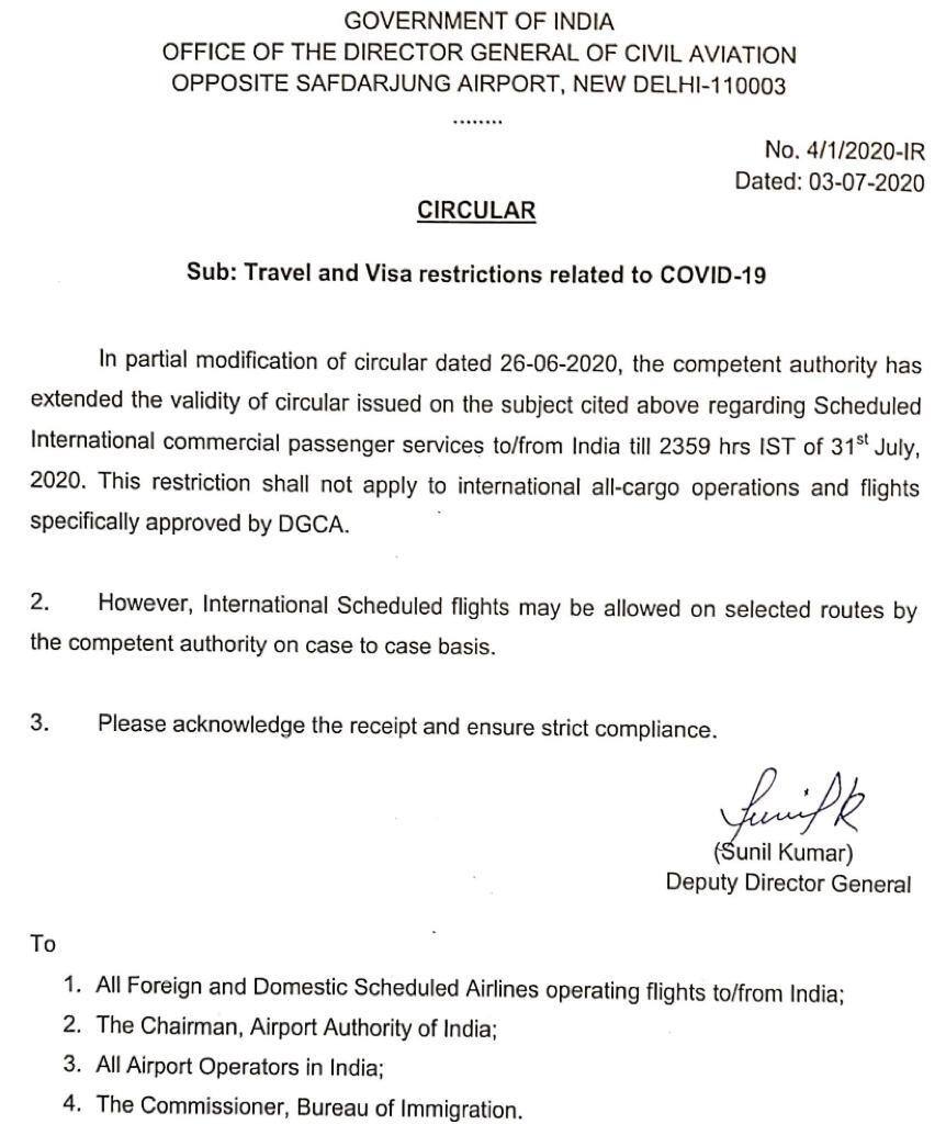 এর আগে বিদেশি উড়ানের ক্ষেত্রে এই নির্দেশিকা ছিল ১৫ জুলাই পর্যন্ত। কয়েক দিন আগে কেন্দ্রীয় স্বরাষ্ট্র দফতর ৩১ জুলাই পর্যন্ত আংশিক লকডাউনের সময়সীমা বাড়ায়। তাতে ছাড় দেওয়া হয়নি আন্তর্জাতিক উড়ানকে। তার জেরেই ৩১ জুলাই পর্যন্ত এই নির্দেশিকা জারি করল ডিজিসিএ। ওই তারিখ পর্যন্ত ভারত থেকে আন্তর্জাতিক উড়ান যেমন যাবে না তেমন , অন্য দেশের বিমান এদেশে নামতেও দেওয়া হবে না। কেন্দ্রীয় অসামরিক বিমান পরিবহণ মন্ত্রকের এক কর্তা বলেন, " ৩১ জুলাই পর্যন্ত আন্তর্জাতিক উড়ানের উপরে নিষেধাজ্ঞা বহাল থাকলেও বন্দে ভারত মিশনের উড়ানগুলি পূর্ব নির্ধারিত সূচি অনুযায়ী চলবে।" এ ছাড়া কোনও উড়ানকে যদি ডিজিসিএ অনুমোদন দেয়, সেই উড়ান চলায় কোনও বাধা নেই। অন্য দিকে, যাত্রী পারাপার বন্ধ থাকলেও পণ্য পরিবহণের উপরে কোনও রকম নিষেধাজ্ঞা জারি করেনি ডিজিসিএ। আগের মতোই ওই সব আন্তর্জাতিক কার্গো বিমান চলবে।