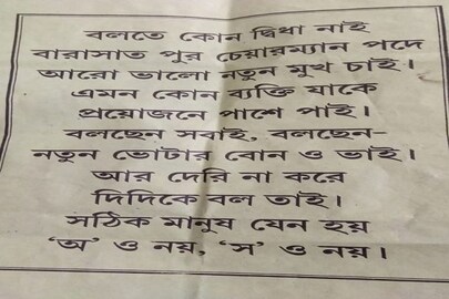 #বারাসত: 'অ' ও 'স'-কে বাদ দিয়ে চেয়ারম্যান পদে নতুন মুখ বেছে নিতে হবে। এমন কী, 'দিদিকে বলো'-তে ফোন করেও একই দাবি জানানোর জন্য় ডাক দেওয়া হয়েছে। পুরভোটের ঠিক আগে এমন বার্তা দিয়ে বারাসতে ছড়ানো হলো লিফলেট। যার জেরে যথেষ্টই অস্বস্তিতে তৃণমূল নেতৃত্ব। সুযোগ বুঝে বিজেপি-র দাবি, গোটাটাই তৃণমূলের গোষ্ঠীদ্বন্দ্বের ফল।