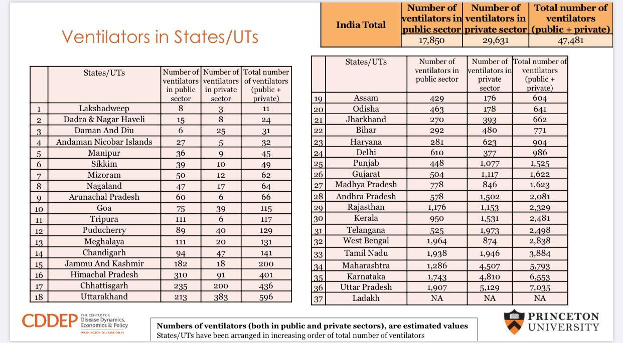 সেন্টার ফর ডিজিজ ডাইনামিক্স, ইকোনমিক্স অ্যান্ড পলিসি (CDDEP) এবং প্রিন্সটন ইউনিভার্সিটির করা একটি সমীক্ষায় উঠে এসেছে, ২০ এপ্রিল, ২০২০ পর্যন্ত দেশে মোট ভেন্টিলেটরের সংখ্যা ছিল ৪৭,৪৮১৷