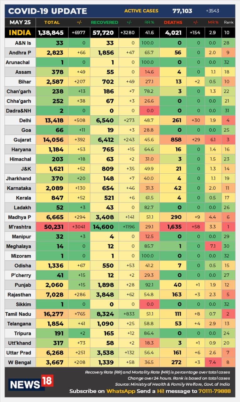 দেশের মধ্যে সব থেকে উদ্বেগজনক জায়গা হচ্ছে মহারাষ্ট্র, গুজরাত, তামিলনাডু ও দিল্লি ৷ সরকারি হিসেবে মহারাষ্ট্রে আক্রান্তের সংখ্যা ৫০ হাজার ২৩১ আর মৃত্যু হয়েছে ১,৬৩৫ জনের৷ গত ২৪ ঘণ্টায় নতুন করে করোনা ভাইরাসে আক্রান্ত হয়েছে ৩ হাজার ৪২ জন। আক্রান্তের সংখায় দ্বিতীয় স্থানে রয়েছে তামিলনাড়ু। সেখানে এখনও মোট আক্রান্তের সংখ্যা ১৬,২৭৭ আর মৃত্যু হয়েছে ১১১ জনের। এর পরেই রয়েছে গুজরাত, এ রাজ্যে আক্রান্ত ১৪ হাজার ৫৬ জন। আর মৃত্যু হয়েছে ৮৫৬ জনের। দিল্লিতে আক্রান্তের সংখ্যা ১৩,৪১৮ আর মৃত্যু হয়েছে ২৬১ জনের।