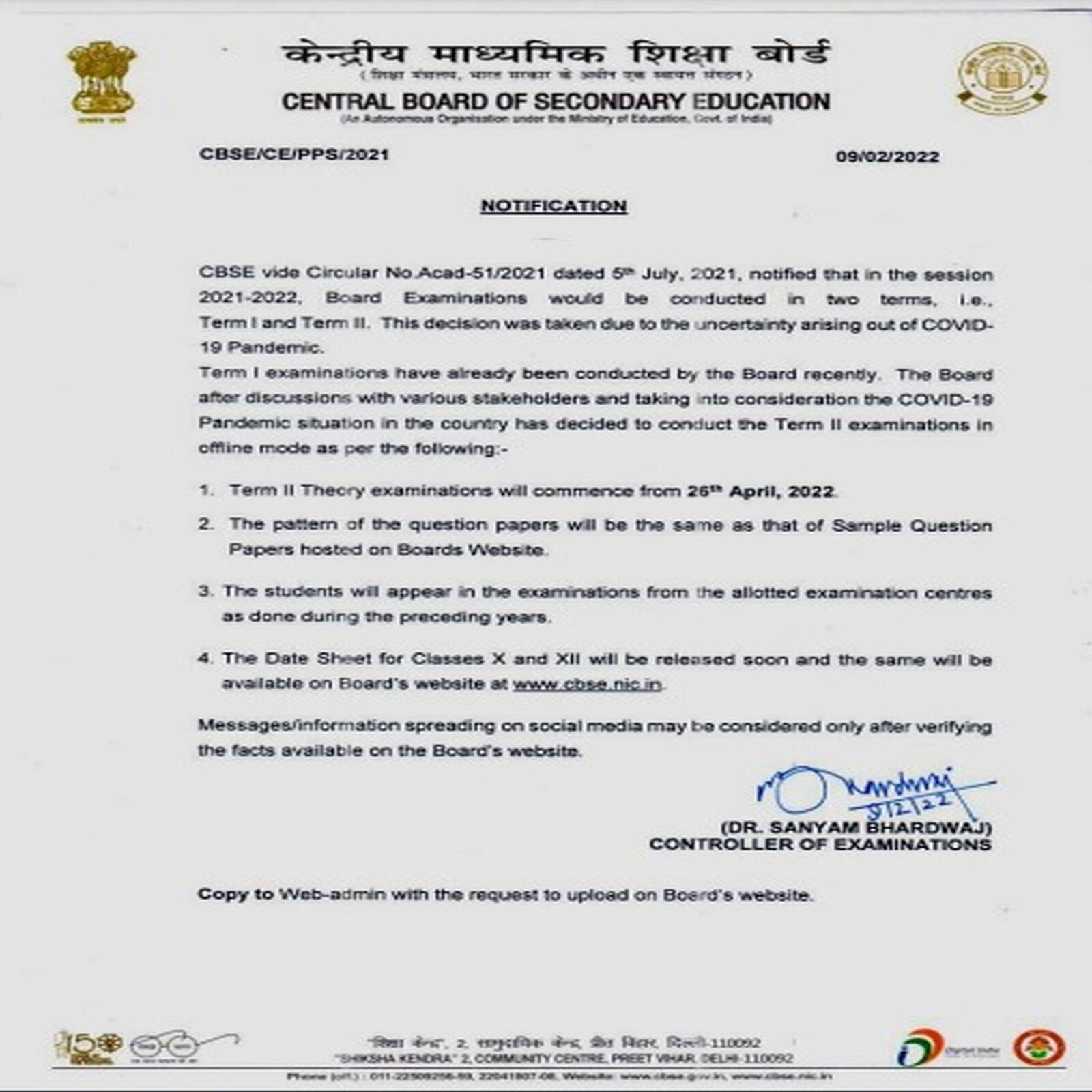 “বিভিন্ন স্টেকহোল্ডারদের সঙ্গে আলোচনার পরে এবং দেশের COVID-19 মহামারী পরিস্থিতি বিবেচনায় রেখে বোর্ড ২ টি পরীক্ষা অফলাইনে (CBSE Term 2 Board Exam 2021-22 Date) নেওয়ার সিদ্ধান্ত নিয়েছে,” বলেন CBSE পরীক্ষা নিয়ন্ত্রক সানিয়াম ভরদ্বাজ।