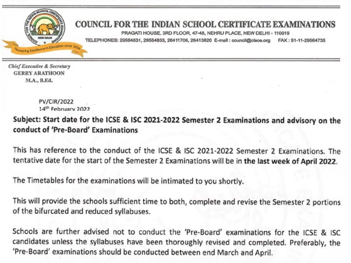 এ দিনের নির্দেশিকায় সিআইএসসিই বোর্ড জানিয়েছে, পরীক্ষার টাইমটেবিল খুব তাড়াতাড়ি ওয়েবসাইটে প্রকাশ করা হবে। কিন্তু পড়ুয়াদের তাতে চিন্তার কোনও কারণ নেই। কারণ সেখানে স্পষ্টভাবে দ্বিতীয় সেমিস্টারের সিলেবাস শেষ করে তারপরে প্রি-বোর্ডের পরীক্ষা নেওয়ার কথা বলা হয়েছে। সেক্ষেত্রে সেই পরীক্ষা হতে পারে মার্চের শেষ থেকে এপ্রিলের মধ্যে।